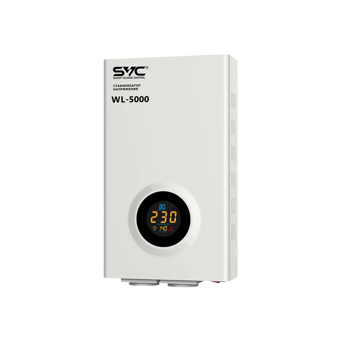 Стабилизатор напряжения релейного типа SVC WL-5000 Применяется для стабилизации выходного напряжения в сетях с однофазным переменным током, частотой 50 Гц. Предотвращает выход из строя электроники на бытовых приборах мощностью до 5000Вт, вследствие колебания напряжения в сети переменного тока. Рекомендуется к применению для защиты управляющей электроники двуконтурных энергозависимых газовых котлов, для защиты компьютерного оборудования и бытовой техники. Данная серия стабилизаторов имеет компактные размеры и предназначена для настенного размещения.
