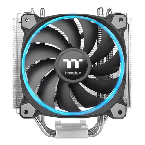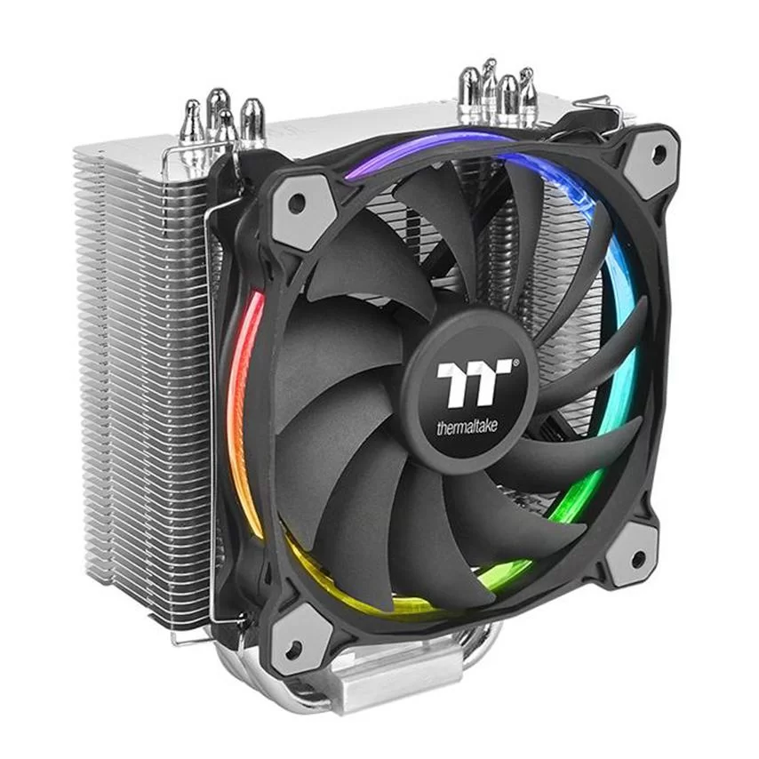 Созданный специально для энтузиастов и геймеров, Thermaltake Riing Silent 12 RGB Sync Edition это эффективный и тихий кулер для центрального процессора, способный отвести до 170Вт тепла. Радиатор состоит из множества алюминиевых пластин толщиной 0,4мм пронизанных четырьмя тепловыми трубками U-образной формы напрямую контактирующих с крышкой CPU. В качестве активного охлаждения используется кулер с запатентованной подсветкой на 256 цветов, которую можно синхронизировать с подсветкой материнских плат поддерживающих технологии ASUS Aura Sync, ASRock RGB LED, BIOSTAR Vivid LED DJ, GIGABYTE RGB Fusion и MSI Mystic Light Sync. Кулер Riing Silent 12 RGB Sync Edition поддерживает все актуальный процессорные разъемы Intel и AMD.