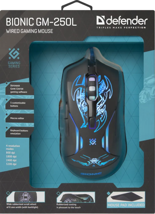 Мышь проводная игровая оптическая Defender Bionic GM-250L (черный),USB, 6 кн. + колесо, + КОВРИК!