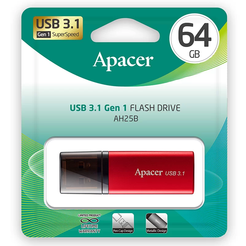 USB-накопитель, Apacer, AH25B, AP64GAH25BR-1, 64GB, USB 3.1, Красный
