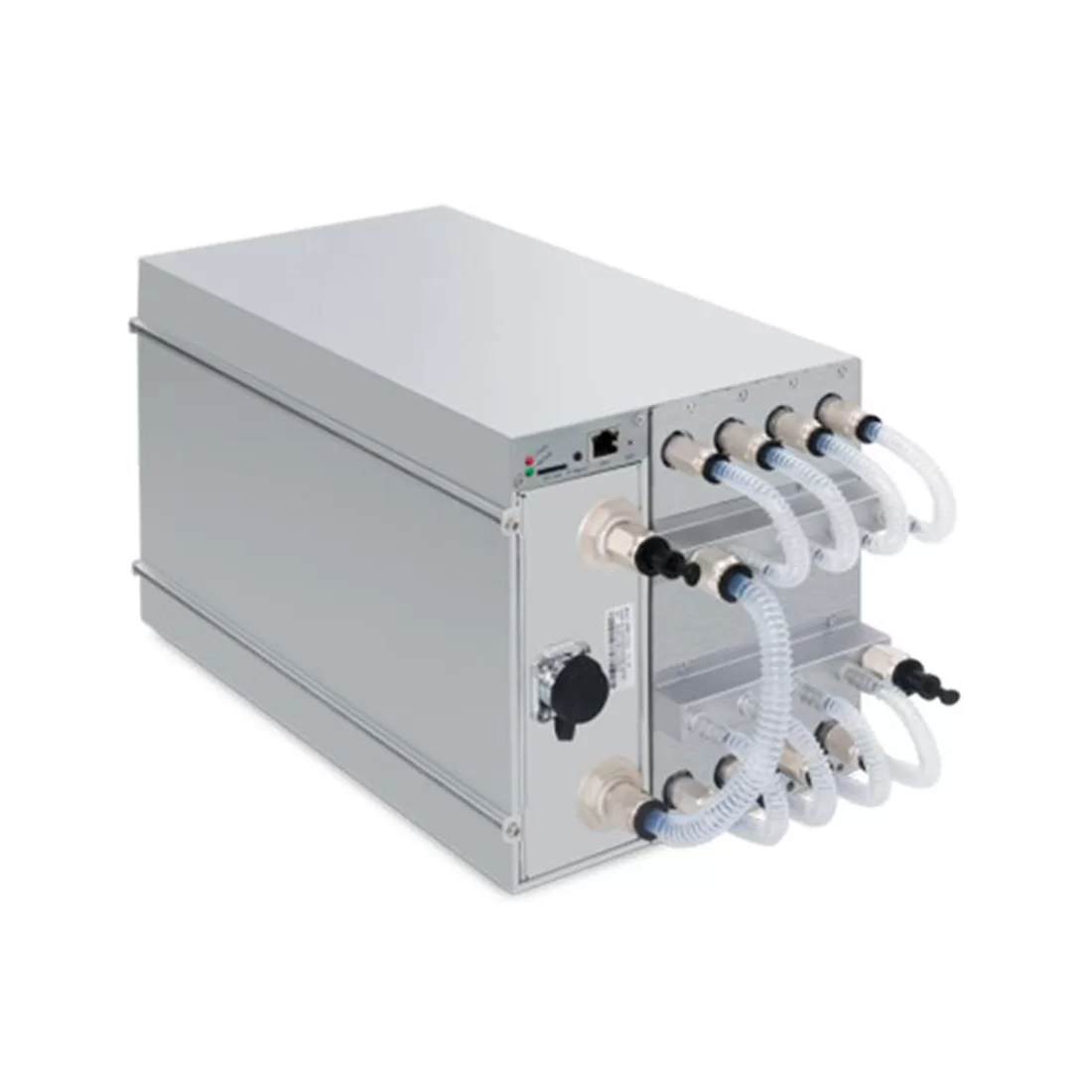 Ключевая особенность данного асика для майнинга, сразу бросающаяся в глаза - система охлаждения. В большинстве моделей бренда используется классическая “воздушная” схема с 2-4 вентиляторами, но в S19 Pro+ Hyd реализовано полноценное водяное охлаждение с коэффициентом передачи тепла более 95%. Кроме того, производитель реализовал усовершенствованный механизм защиты от протечек, позволяющий заметно продлить срок работы асика. Модель тихая, так как в ней отсутствуют вентиляторы, а шум создают только насос и вода, текущая по трубкам.